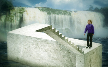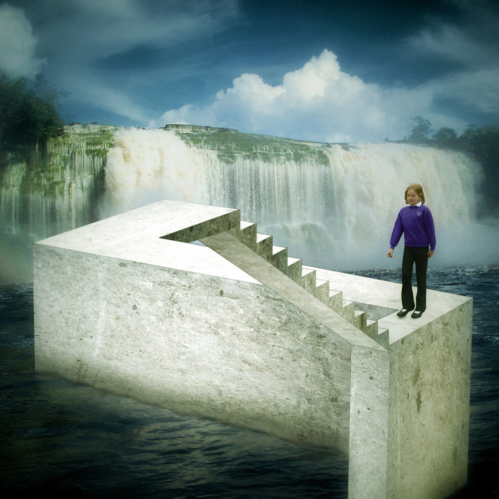 A lucid dream of a distorted world! The platform and stair form an impossible continuous loop... The little girl could walk and climb around in a circle forever the stair and never get any higher.